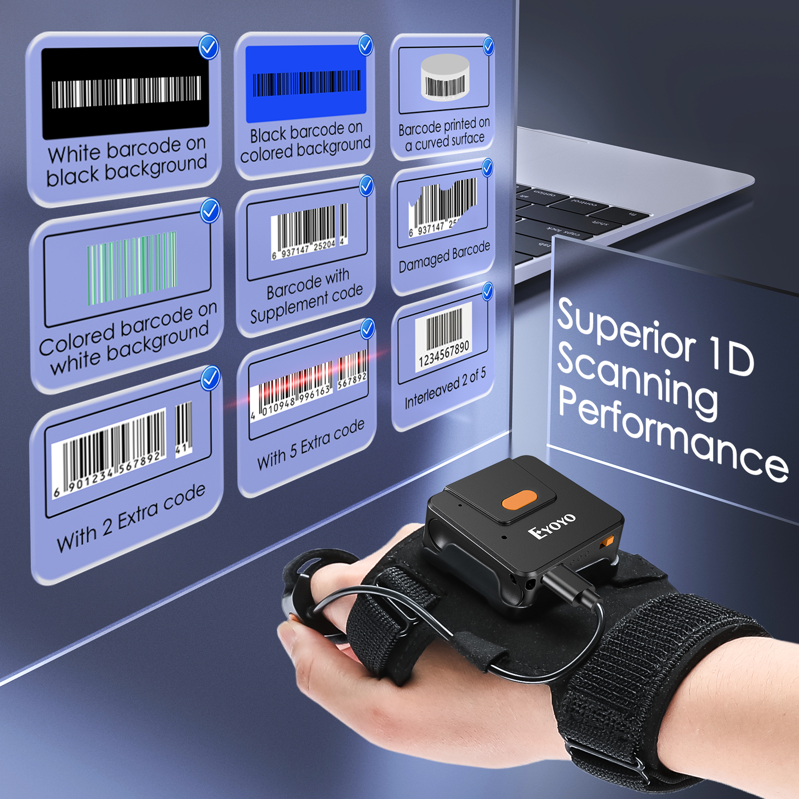 Eyoyo Wearable Glove 1D Bluetooth Barcode Scanner Laser Finger Trigger Wireless Inventory Bar Codes Reader Works With Phones PC